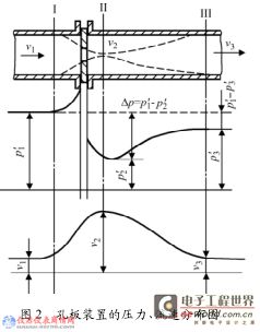 充滿管道的流體流經(jīng)管道內(nèi)的節(jié)流裝置,由于節(jié)流元件造成的流束局部收縮,使管中心流體流速發(fā)生變化,其靜壓力隨之變化。由于流體流經(jīng)孔板時,產(chǎn)生局部渦流損耗和摩擦阻力損失,在流束充分恢復(fù)后,靜壓力不能恢復(fù)到原來的數(shù)值。節(jié)流元件前后的靜壓差大小與流量有關(guān),流量愈大,流束的收縮和動、靜壓能的轉(zhuǎn)換也愈顯著,則產(chǎn)生的壓差也愈大。只要測得節(jié)流元件前后的靜壓差大小,即可確定流量,這就是節(jié)流裝置測量流量的基本原理,如圖2 所示。這種測量方法是以能量守恒定律和流動連續(xù)性方程為基礎(chǔ)的。